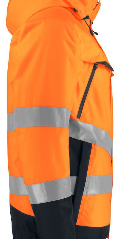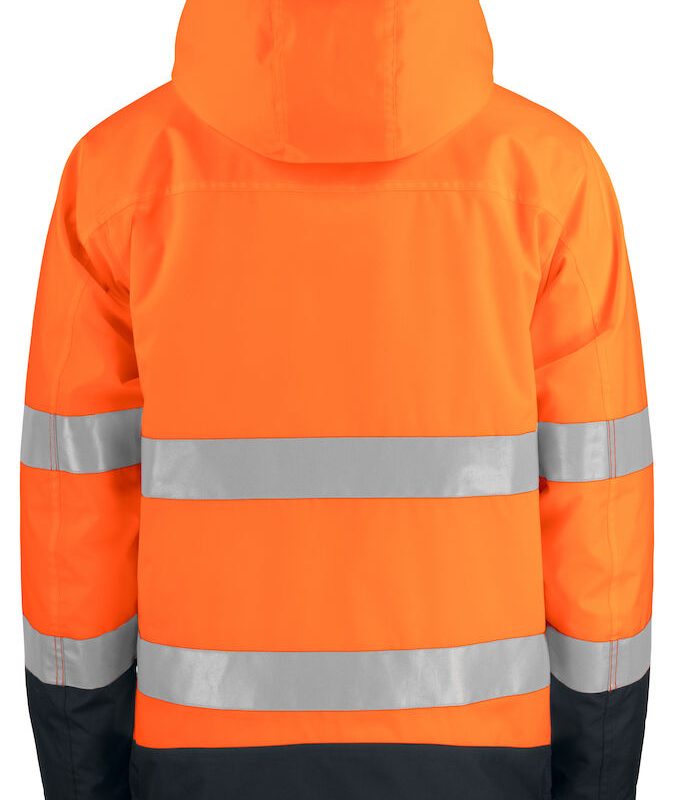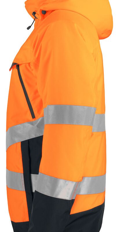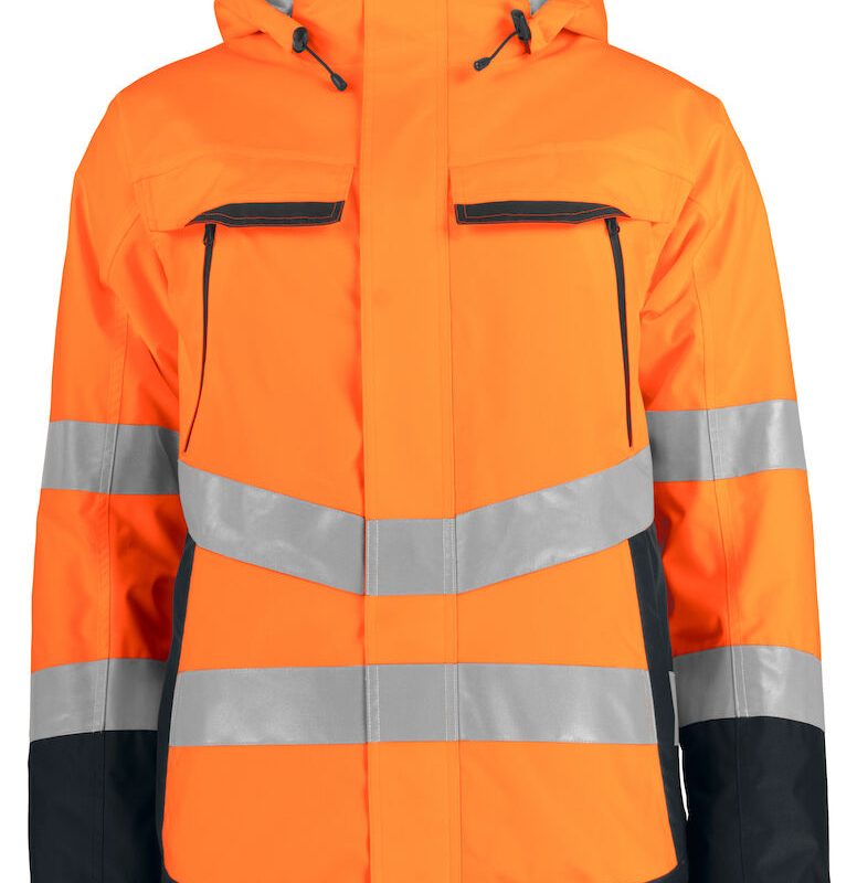 Parka doublée – Coupe-vent / imperméable 5000 mm / Respirante 5000 grs m2/24hrs – Coutures thermo-soudées – Bonne respirabilité – Zip central YKK® a/ ouverture double sens haut + bas sous rabat – 2 poches poitrine sous rabat + 2 poches frontales zippées a/ doublure polaire – D-ring dans la poche poitrine gauche pour le badge d’identité – 3 poches intérieures – Doublure matelassée a/ ouverture pour broderie ou sérigraphie – Capuche réglable et détachable – Poignets ajustables – Couvre reins – Manches sans couture aux épaules – EN 343 3/1 – Bandes HV horizotales EN ISO 20471 Classe 3