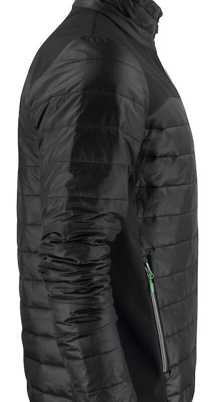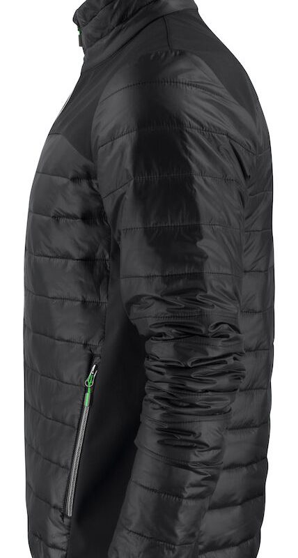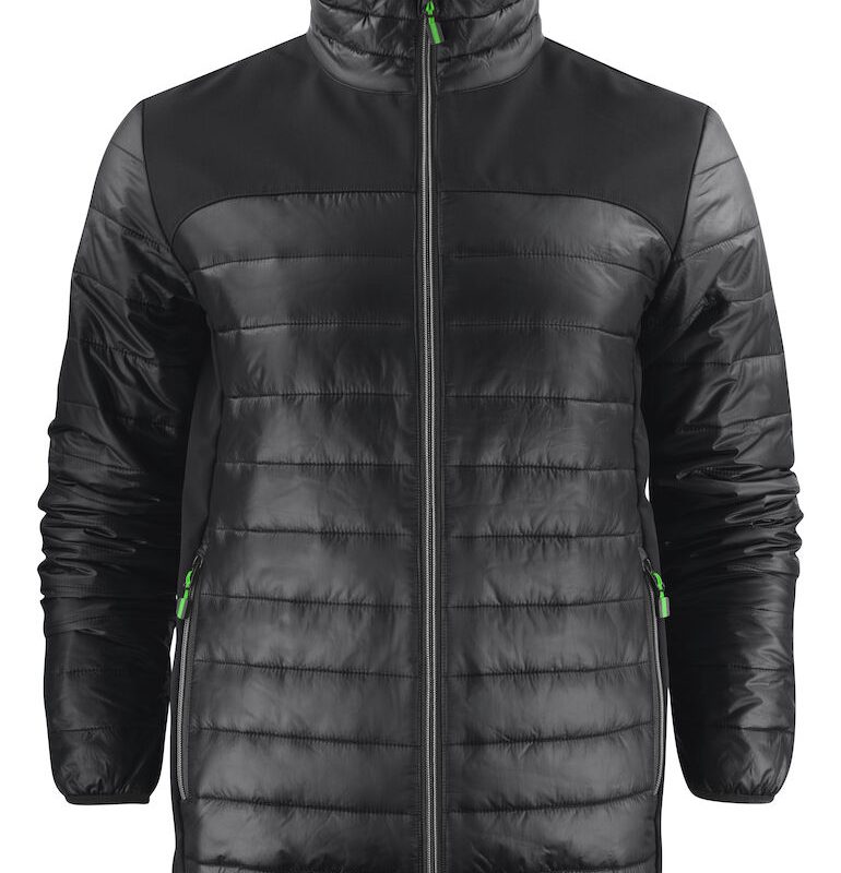 Softshell ultra-légère. Epaules et parties latérales en softshell (tissu 1). Manches, dos et face en doudoune légère (tissu 2). Zips bicolores et tires-zips de couleur contrastée. Bords élastiqués aux manches et bas de la veste.