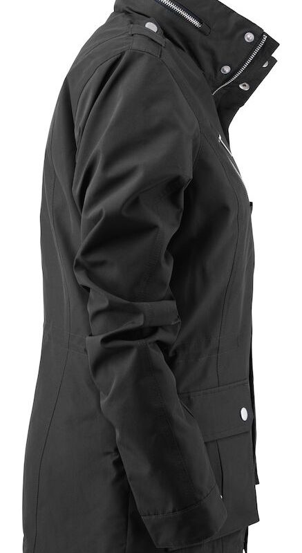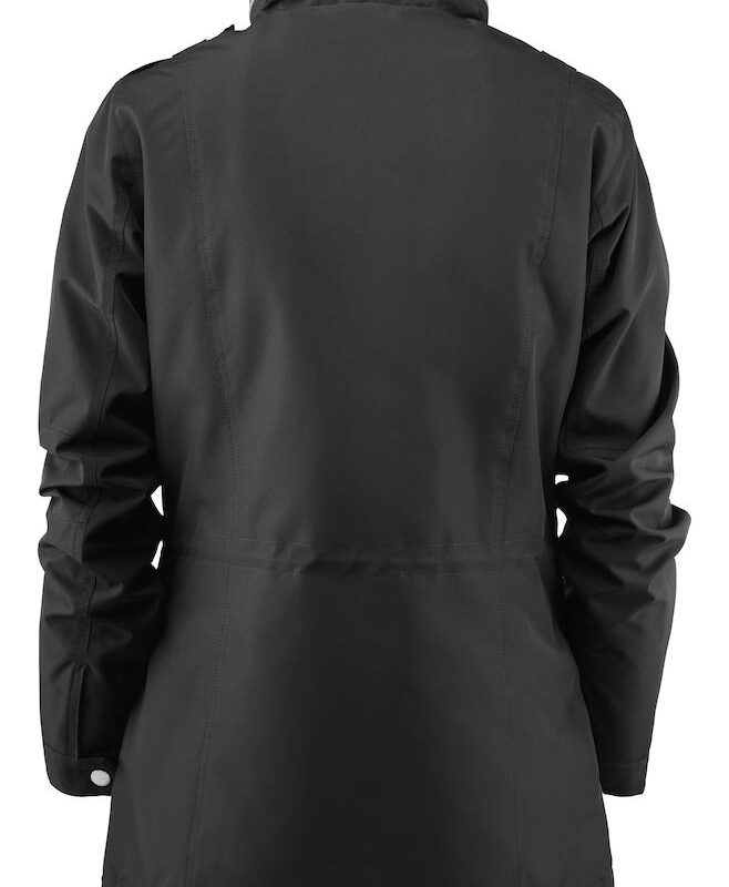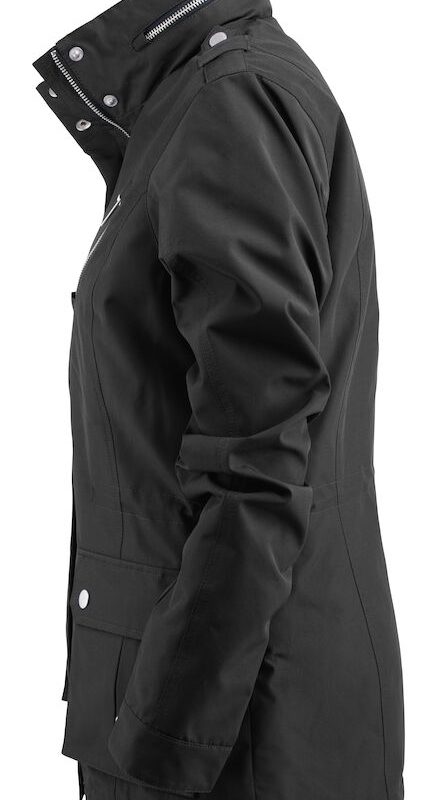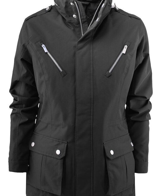 Elégante veste urbaine doublée, légère avec capuche insérée dans le col. Epaulettes à pression. Deux poches à soufflet et deux poches poitrine avec zip en métal.