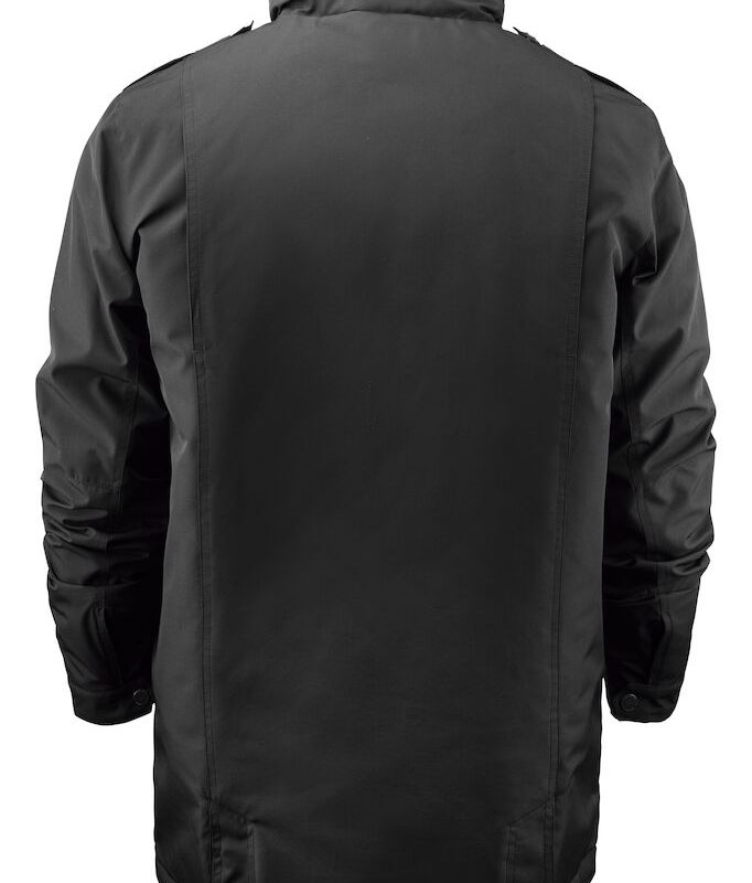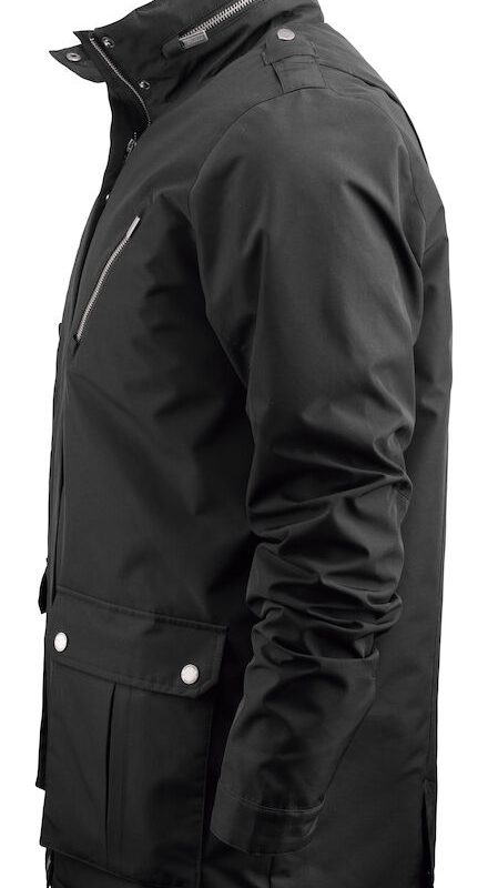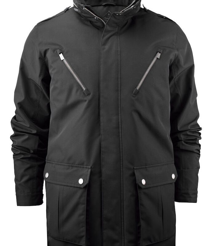 Elégante veste urbaine doublée, légère avec capuche insérée dans le col. Epaulettes à pression. Deux poches à soufflet et deux poches poitrine avec zip en métal.